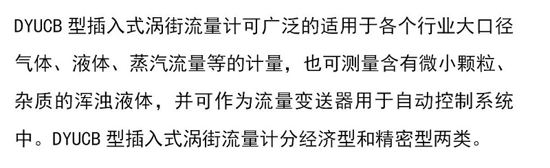 DYUCB型插入式渦街流量計可廣泛的適用于各個行業大口徑氣體、液體、蒸汽流量等的計量,也可測量含有微小顆粒、雜質的渾濁液體,分經濟型和精密型兩類。